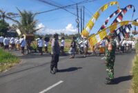 Personil Polsek Blahbatuh melaksanakan pengamanan kegiatan adat Nunas Tirta Ning yang dirangkaikan dengan prosesi mapeed oleh krama Desa Adat Pering, Kecamatan Blahbatuh, Kabupaten Gianyar,…