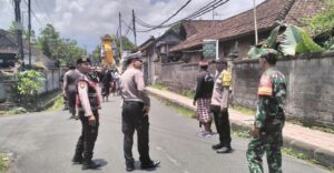 Wujudkan dalam bentuk kepedulian terhadap masyarakat binaan, Babinsa Desa Tegal Tugu Koramil 1616-01/Gianyar Sertu I Made Sukajaya bersama Bhabinkamtibmas Desa Tegal Tugu Aiptu Gusti Ngurah Agung Gede Raka serta Pecalang Desa Adat Tegal Tugu melaksanakan pengamanan dan pengaturan lalu lintas dalam rangka Upacara Pitra Yadnya (Ngaben) yang berlangsung di wilayah Desa Adat Tegal Tugu, Kecamatan Gianyar, Kabupaten Gianyar, pada Minggu (02/11/2025).
