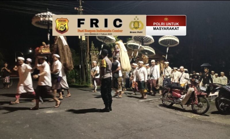 Bhabinkamtibmas/Bhabin Desa Sobangan Aiptu I Kadek Suastika bersinergi dengan Pecalang Desa Adat Sobangan melaksanakan pengamanan kegiatan keagamaan dalam bentuk Piodalan di Pura Desa, Desa Adat Sibangan, Desa Sobangan, Kecamatan Mengwi, Kabupaten Badung, pada Selasa (02/12/2025) pukul 19.00 Wita.