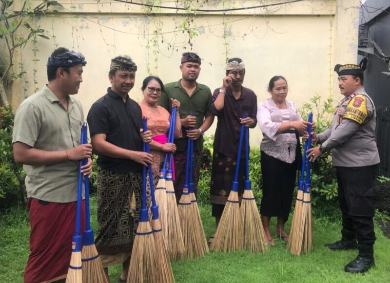 “Bhabinkamtibmas Desa Singakerta Aiptu I Made Widastra dalam hal ini menyampaikan kegiatan pemberian sarana kontak diberikan kepada warga masyarakat Desa Singakerta berupa alat kebersihan sapu lidi dan serok sampah.