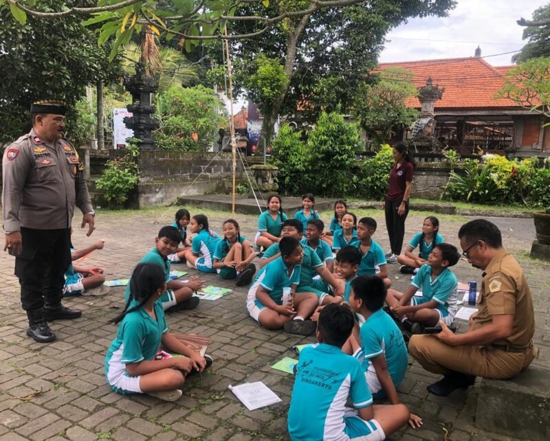 Bhabinkamtibmas Desa Singakerta Polsek Ubud Polres Gianyar Aiptu I Made Widastra melaksanakan sambang di SD Negeri 5 Singakerta bertemu siswa yang sedang berolah raga, pada Selasa (10/02/2026).