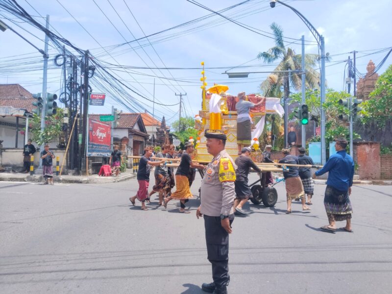 Dalam rangka memberikan pelayanan serta menjaga keamanan kegiatan masyarakat, Bhabinkamtibmas Kelurahan Kesiman Bripka Wayan Artawa melaksanakan pengamanan kegiatan upacara adat Pelebon yang berlangsung, pada Senin (23/03/2026) di wilayah Kelurahan Kesiman, Denpasar Timur.