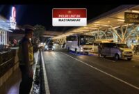 Personil Polres Kawasan Bandara I Gusti Ngurah Rai melaksanakan pengaturan arus lalu lintas di area drop zone Terminal Internasional, pada Senin (10/11/2025) malam. Pengaturan…