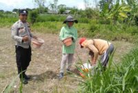 Bhabinkamtibmas Desa Satra Polsek Klungkung, Aiptu I Wayan Antara, melaksanakan kegiatan sambang ke petani jagung yang sedang melakukan pemupukan tanaman jagung di Subak Toya…