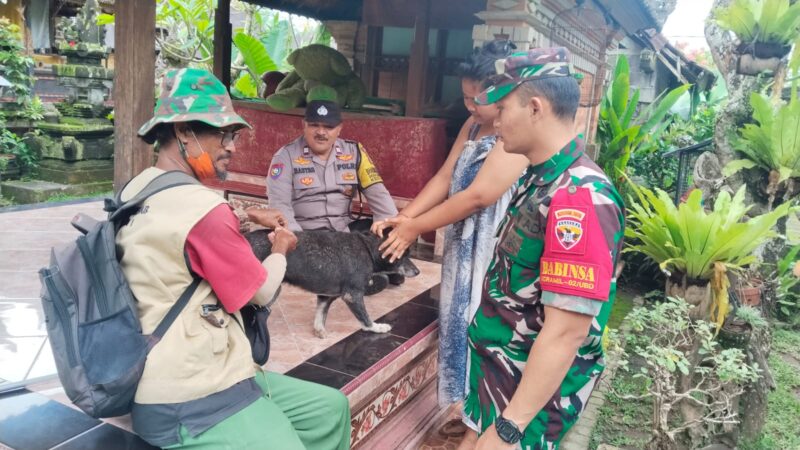 Upaya pencegahan penyakit rabies terus digencarkan di wilayah Desa Singakerta. Bhabinkamtibmas Desa Singakerta Aiptu I Made Widastra bersama Babinsa Singakerta Ramil 1616-02/Ubud Kopda Kadek Endra melaksanakan pendampingan kegiatan vaksinasi rabies yang digelar oleh Dinas Pertanian dan Peternakan, Selasa (03/03/2026) pagi.