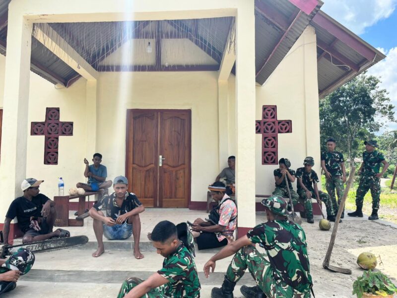 Di sela-sela kegiatan fisik program TMMD ke-128, anggota Satgas memanfaatkan waktu istirahat untuk melaksanakan komunikasi sosial (komsos) bersama warga di Desa Umbu Wangu, Kecamatan Wewewa Selatan, Kabupaten Sumba Barat Daya, Jumat (24/04/2026).