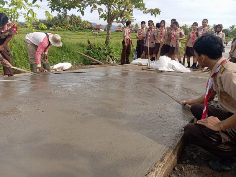 Di bawah terik matahari yang menyengat di Desa Penyaringan, deru mesin molen dan denting sekop personil Satgas TMMD ke-127 Kodim 1617/Jembrana terasa berbeda hari ini, pada Minggu (01/03/2026). Ada pemandangan humanis yang menjadi penyejuk di tengah beratnya pengerjaan fisik jalan sepanjang 1.373 meter: kehadiran dan dukungan moral dari para pelajar setempat.