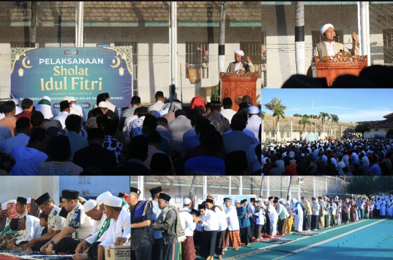 Dinding beton yang kokoh dan kawat berduri tak menghalangi semangat ratusan warga binaan Lembaga Pemasyarakatan (Lapas) Kelas IIA Banyuwangi untuk menjemput hari kemenangan. Mereka berbondong-bondong memadati Lapangan Blok Griya Blambangan untuk menunaikan Sholat Idul Fitri 1 Syawal 1447 H, pada Sabtu (21/03/2026).