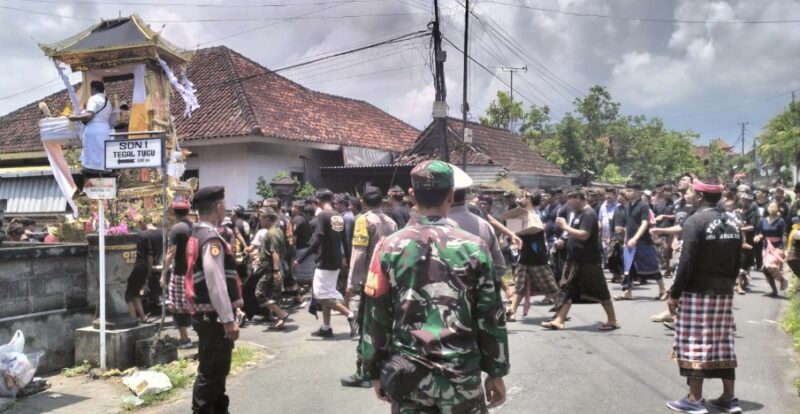 Wujudkan dalam bentuk kepedulian terhadap masyarakat binaan, Babinsa Desa Tegal Tugu Koramil 1616-01/Gianyar Sertu I Made Sukajaya bersama Bhabinkamtibmas Desa Tegal Tugu Aiptu Gusti Ngurah Agung Gede Raka serta Pecalang Desa Adat Tegal Tugu melaksanakan pengamanan dan pengaturan lalu lintas dalam rangka Upacara Pitra Yadnya (Ngaben) yang berlangsung di wilayah Desa Adat Tegal Tugu, Kecamatan Gianyar, Kabupaten Gianyar, pada Minggu (02/11/2025).
