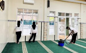 Seluruh peserta tampak antusias melaksanakan kerja bakti membersihkan seluruh area dalam dan halaman luar masjid, serta penataan sarana ibadah. Suasana kebersamaan dan keakraban tampak jelas, masing-masing saling membantu menyelesaikan setiap bagian pekerjaan.