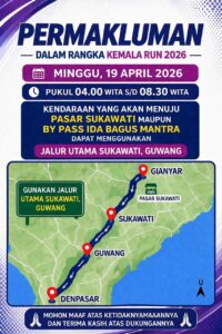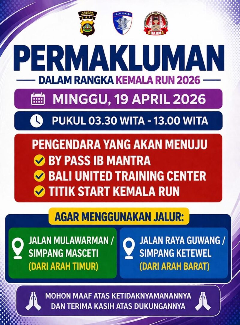 Dalam rangka mendukung kelancaran Kemala Run tanggal 19 April 2026 , Polda Bali melalui Kabid Humas Kombes Pol Aria Sandy, S.I.K., resmi mengumumkan permakluman terkait penutupan dan pengalihan arus lalu lintas di kawasan Jl. By Pass Ida Bagus Mantra Gianyar, pada Kamis (9/4/2026).