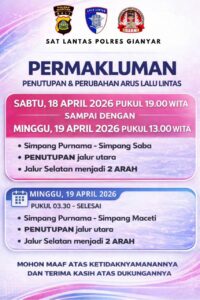Untuk waktu dan lokasi Rekayasa lalu lintas akan difokus pada “Jl. By Pass Ida Bagus Mantra Gianyar”, mulai dari Simpang Pantai Purnama hingga Simpang Pantai Saba dimulai Sabtu, 18 April pukul 19.00 Wita s/d Minggu, 19 April 2026 pukul 13.00 Wita.