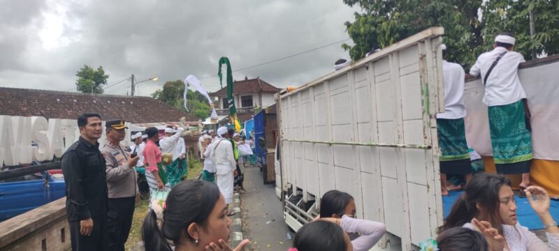 Personel Polsek Mengwi disiagakan di sepanjang jalur yang dilalui iringan untuk memastikan kelancaran arus lalu lintas serta memberikan rasa aman bagi umat yang melaksanakan persembahyangan.