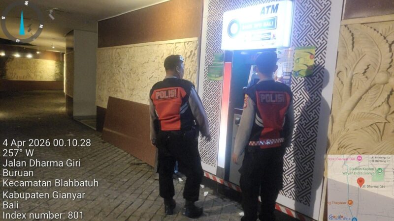 Dalam upaya menjaga situasi kamtibmas tetap aman dan kondusif, Satuan Samapta Polres Gianyar melaksanakan patroli rutin, pada Sabtu (4/4/2026) dini hari dengan menyasar kawasan perbankan dan mesin ATM di wilayah Kota Gianyar.