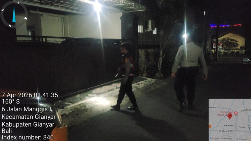 Dalam upaya menjaga situasi kamtibmas tetap aman dan kondusif, personel Sat Samapta Polres Gianyar melaksanakan patroli pada jam rawan dengan menyambangi permukiman rumah warga di kawasan Jalan Manggis, Kecamatan Candi Baru, Gianyar, pada Selasa (7/4/2026) dini hari.