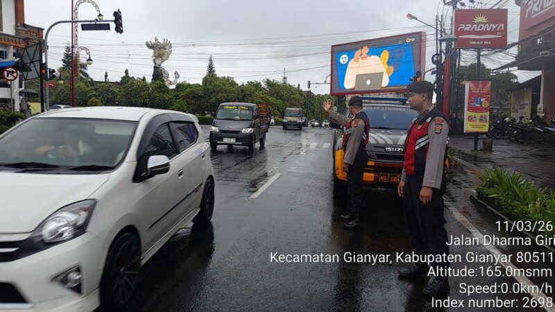 Kegiatan patroli dilaksanakan pada Rabu (11 Maret 2026) pukul 10.20 WITA oleh 3 personil Sat Samapta Polres Gianyar menggunakan kendaraan dinas roda empat (R4) dengan menyasar strong point Simpang Aries, Gianyar yang merupakan salah satu titik rawan aktivitas masyarakat dan lalu lintas.