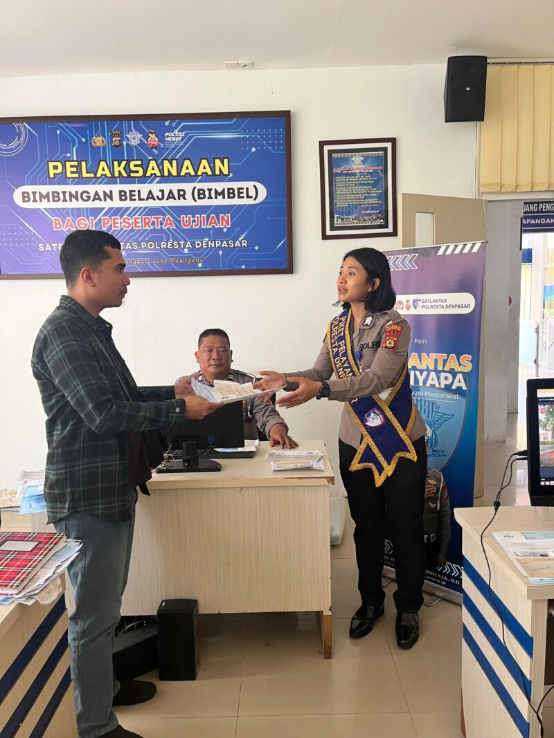“Polantas Menyapa”, personel Satlantas Polresta Denpasar secara aktif memberikan pendampingan kepada peserta ujian pemohon SIM, menjelaskan prosedur serta tata cara pengisian soal ujian dengan ramah dan penuh kesabaran.