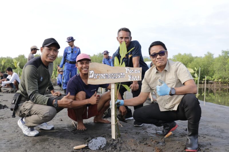 Kepolisian Daerah (Polda) Bali bersinergi dengan Warga Desa Sumberklampok, Kecamatan Gerokgak Kabupaten Buleleng melakukan kegiatan penanaman mangrove di Teluk Terima, kawasan Hutan Taman Nasional Bali Barat. Kegiatan ini bertujuan untuk memulihkan ekosistem pantai dan mengurangi dampak perubahan iklim, pada Kamis (23/10/2025).