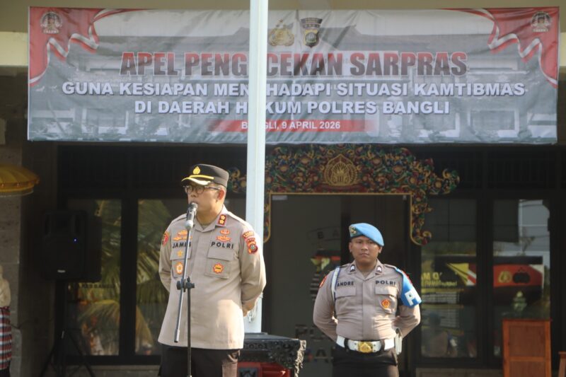 Dalam rangka memastikan kesiapan menghadapi dinamika situasi keamanan dan ketertiban masyarakat (Sitkamtibmas), Polres Bangli menggelar Apel Pengecekan Sarana dan Prasarana (Sarpras), pada Kamis (9 April 2026), pukul 08.00 hingga 08.30 Wita. Kegiatan tersebut berlangsung di Lapangan Polres Bangli dan dipimpin langsung oleh Kapolres Bangli, AKBP James I. S. Rajagukguk, S.I.K., M.H.
