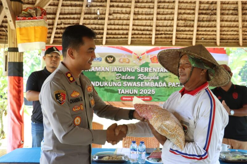 Dalam rangka mendukung program pemerintah menuju swasembada pangan nasional, Polres Gianyar melaksanakan kegiatan Minggu Kasih yang dirangkaikan dengan penanaman jagung serta bakti sosial (baksos) di area Puspa Aman, Desa Bakbakan, Kecamatan Gianyar, pada Jumat (24/10/2025).