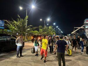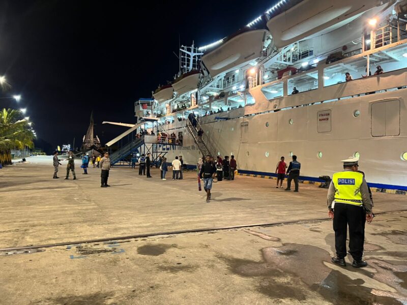 Personil Kepolisian Sektor (Polsek) Kawasan Pelabuhan Benoa memberikan pelayanan atas kedatangan kapal penumpang KM Leuser yang telah tiba dan menyandar dengan aman di Dermaga Timur Pelabuhan Benoa, pada Kamis (30/10/2025) malam pukul 23.50 Wita.