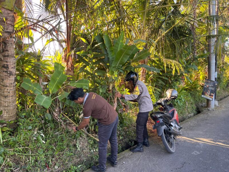 Dalam rangka mendukung dan mensukseskan kegiatan Kemala Run, jajaran Polsek Blahbatuh melalui Bhabinkamtibmas Desa Saba Aipda I Nyoman Mara Arta bersinergi bersama Bhabinsa Desa Saba Pelda I Wayan Yasa melaksanakan kegiatan pembersihan lingkungan di sepanjang Jalan Raya Blangsinga menuju Jalan Raya Bonbiyu, Desa Saba, Kecamatan Blahbatuh, pada Jumat (17/4/2026) pagi.