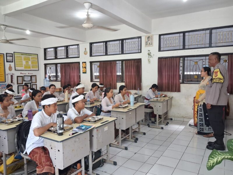 Dalam rangka mendukung program pemerintah terkait Makan Bergizi Gratis (MBG), Bhabinkamtibmas Kelurahan Sanur Aiptu I Nyoman Suwasama melaksanakan sambang sekaligus pemantauan kegiatan pembagian MBG kepada para siswa di SMP Negeri 9 Sanur, pada Senin (02/02/2026) pukul 11.30 Wita.