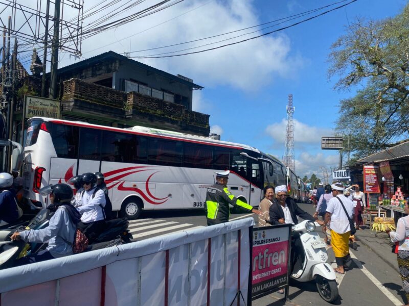 Pada Minggu (19/04/2026) sejak pukul 11.00 WITA hingga kegiatan berakhir, personel yang dipimpin oleh Kanit Lantas IPTU I Nengah Bagiadnyana tampak aktif melaksanakan penjagaan di depan Pura Batur hingga Simpang Katung. Kehadiran aparat kepolisian ini tidak hanya berfokus pada pengamanan wilayah, tetapi juga memberikan pelayanan humanis kepada masyarakat.