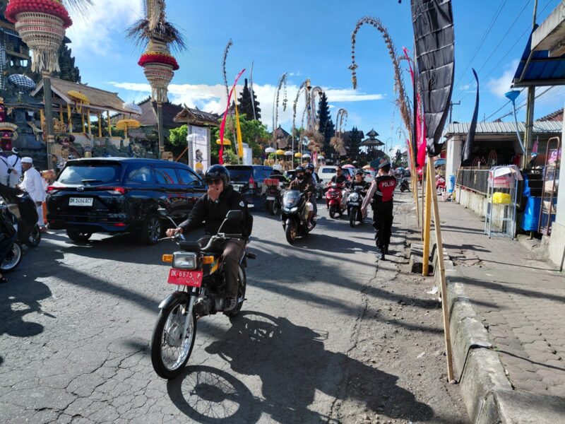 Polsek Kintamani kembali menunjukkan kesiapsiagaannya dalam memberikan pelayanan terbaik kepada masyarakat dengan melaksanakan pengamanan dan pengaturan arus lalu lintas di depan Pura Batur, pada Senin (20/4/2026).
