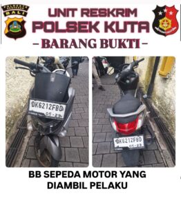 “Berdasarkan laporan korban dan hasil olah TKP serta rekaman CCTV di sekitar lokasi, tim berhasil mengidentifikasi pelaku dan melakukan penangkapan di wilayah Tuban, Kuta, Badung. Saat diamankan, pelaku beserta barang bukti sepeda motor langsung dibawa ke Polsek Kuta untuk pemeriksaan lebih lanjut,” ujar Kompol Agus Riwayanto.