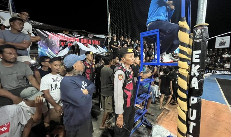 Personil Polsek Nusa Penida melaksanakan pengamanan kegiatan Turnamen Bola Voli Eka Putra Cup II yang berlangsung di Lapangan Batununggul, Kecamatan Nusa Penida, Kabupaten Klungkung, pada Sabtu malam (07/02/2026).