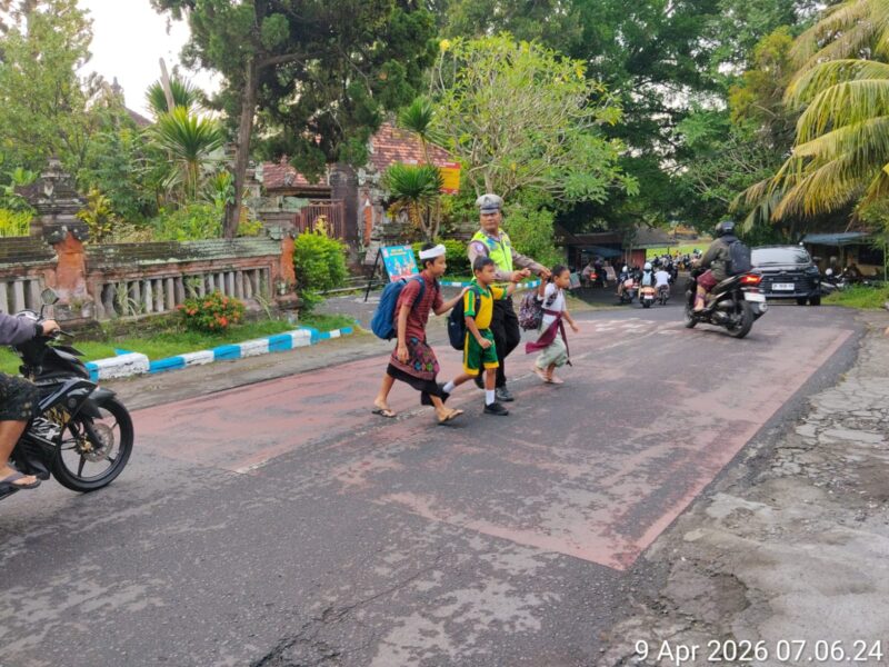 Dalam rangka mewujudkan keamanan, keselamatan, ketertiban, dan kelancaran lalu lintas (kamtibselcarlantas), personel Polsek Gianyar melaksanakan kegiatan pengaturan arus lalu lintas (pos pagi) di depan SD Negeri 2 Gianyar, Jalan Ratna, Desa Tegal Tugu, Kecamatan Gianyar, pada Kamis (9/4/2026). Kegiatan ini merupakan bagian dari pelayanan rutin kepolisian di jam-jam rawan kepadatan, khususnya saat aktivitas masyarakat meningkat di pagi hari.