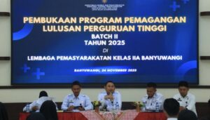 Lembaga Pemasyarakatan (Lapas) Kelas IIA Banyuwangi menjadi salah satu institusi penerima dalam Program Pemagangan Nasional Batch 2 yang diselenggarakan oleh Kementerian Ketenagakerjaan (Kemnaker). Puluhan atau tepatnya 36 peserta yang dinyatakan lolos untuk menjalani program magang di Lapas Banyuwangi secara resmi memulai kegiatan dengan mengikuti sesi orientasi, pada Senin (24/11/2025).
