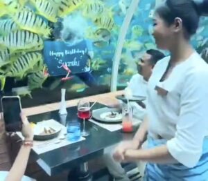 Tak hanya itu, beberapa penyelam lain yang ikut berpartisipasi juga membentuk formasi angka “37” di dalam air, sementara musik perayaan yang lembut dimainkan dari luar akuarium. Tamu undangan yang terdiri dari keluarga dekat dan rekan bisnis juga ikut meramaikan acara dengan bersorak dan mengambil foto momen spesial tersebut.