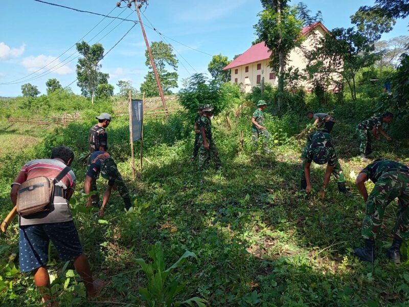 Terlihat semangat gotong royong antara TNI dan masyarakat dalam menyiapkan lahan, mulai dari pemotongan semak belukar hingga perataan area.