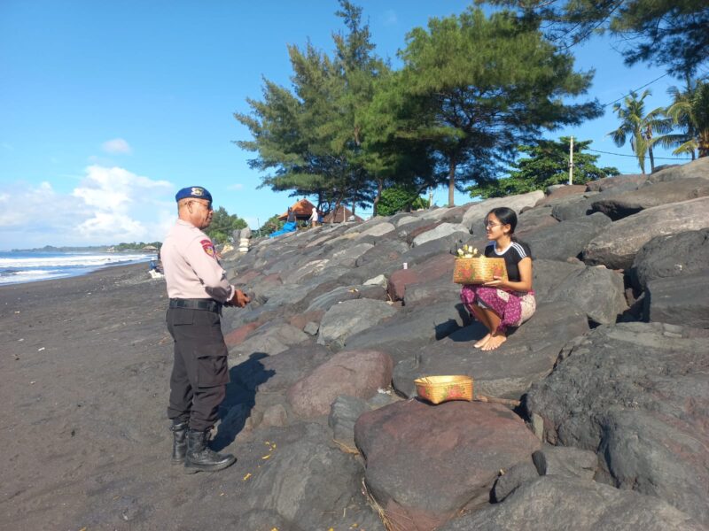 Personil Polisi Banjar Satpolairud Polres Gianyar melaksanakan kegiatan sambang dan imbauan kepada masyarakat yang beraktivitas di kawasan pesisir Pantai Masceti, Desa Medahan, Kecamatan Blahbatuh, Kabupaten Gianyar, Sabtu (14/3/2026) pukul 09.40 WITA.