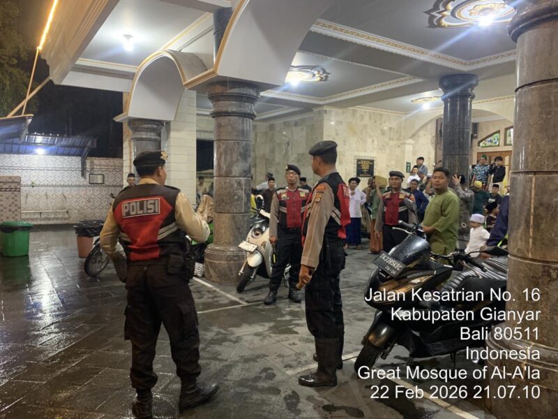 Personil Sat Samapta Polres Gianyar melaksanakan patroli dan pengamanan kegiatan Sholat Tarawih di Masjid Agung Al-Ala Gianyar, Jalan Kesatrian No.16 Gianyar, pada Minggu (22/02/2026) pukul 20.30 Wita hingga selesai.