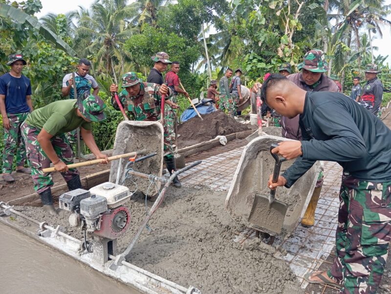 Dalam pengerjaan tersebut, personel Satgas TMMD bersama masyarakat setempat bahu-membahu melakukan pemasangan plastik landasan dan wiremesh sebagai penguat struktur beton. Berkat kerja sama yang solid, pengerjaan rabat beton pada hari ini berhasil mencapai panjang 60 meter.