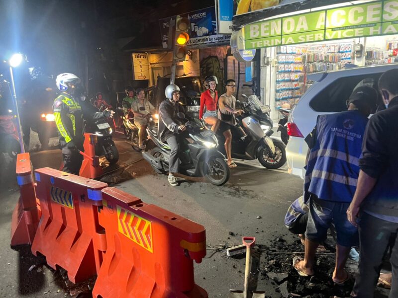 Personil Lalu Lintas Polsek Kuta Utara Aipda I Nyoman Suparta bersama Bripda Damar Piteket melakukan pengaturan arus lalu lintas malam hari di simpang Berawa, Desa Tibubeneng, Kecamatan Kuta Utara, Kabupaten Badung, Bali, terkait adanya perbaikan pipa PDAM (Perusahaan Daerah Air Minum) yang mengalami kerusakan, pada Rabu (03/01/2026) pukul 23.30 Wita.