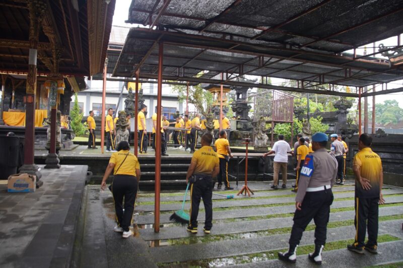 Personel Polres Bangli dengan semangat dan kerja sama yang baik melaksanakan kegiatan bersih-bersih dan pemasangan perlengkapan di Pura Giri Bratha. Kegiatan ini tidak hanya bertujuan untuk membersihkan dan memperindah pura, tetapi juga sebagai bentuk penghormatan dan rasa syukur kepada Tuhan Yang Maha Esa.