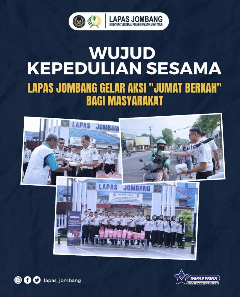 Sebagai bentuk nyata kepedulian sosial dan rasa kemanusiaan terhadap sesama, Lembaga Pemasyarakatan (Lapas) Jombang kembali menggelar kegiatan sosial bertajuk “Jumat Berkah”. Kegiatan mulia ini menjadi wadah bagi seluruh jajaran untuk berbagi kebahagiaan dan menebar kebaikan kepada masyarakat yang membutuhkan di lingkungan sekitar, pada Jumat (17/04/2026).