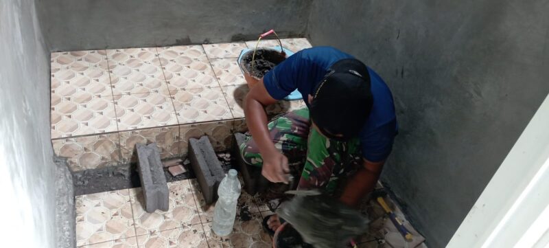 Pada hari Kamis (26/02/2026), fokus utama pengerjaan diarahkan pada pembangunan fasilitas MCK milik Bapak I Ketut Sutarma di Banjar Tibu Beleng Kelod. Di bawah pimpinan Serka Made Yartana, personel Satgas nampak bahu-membahu melakukan proses ngaci pondasi dan pemasangan keramik lantai dengan penuh ketelitian.